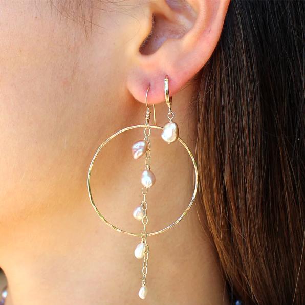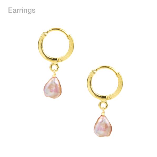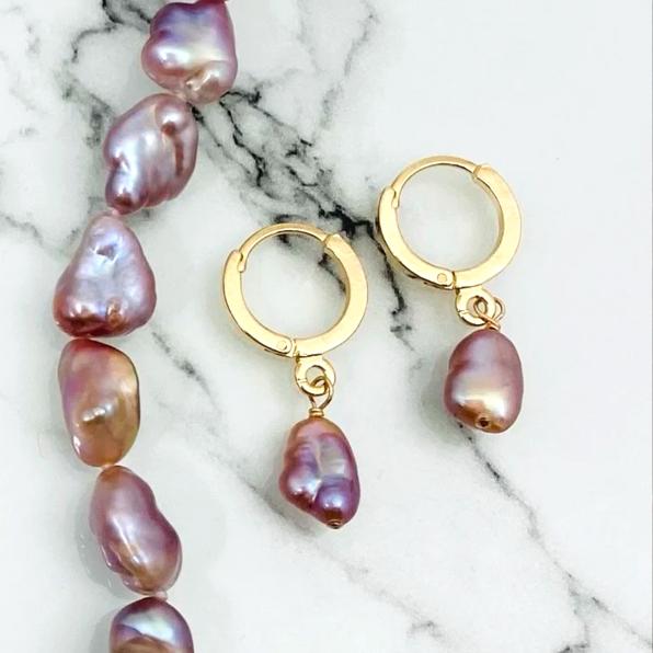 ピンクケシの淡水パールピアス。 動くたびに、パールが美しく揺れ動き、デイリーにもパーティーにもぴったりです。 ハギー幅:約1.2cm パール幅 : 約0.6〜0.7cm 素材 : 淡水ケシパール / 14ktヴェルメイユ ※天然素材を使っているため、色味や大きさ、形状が、商品画像と多少異なる場合がございます。予めご了承ください。