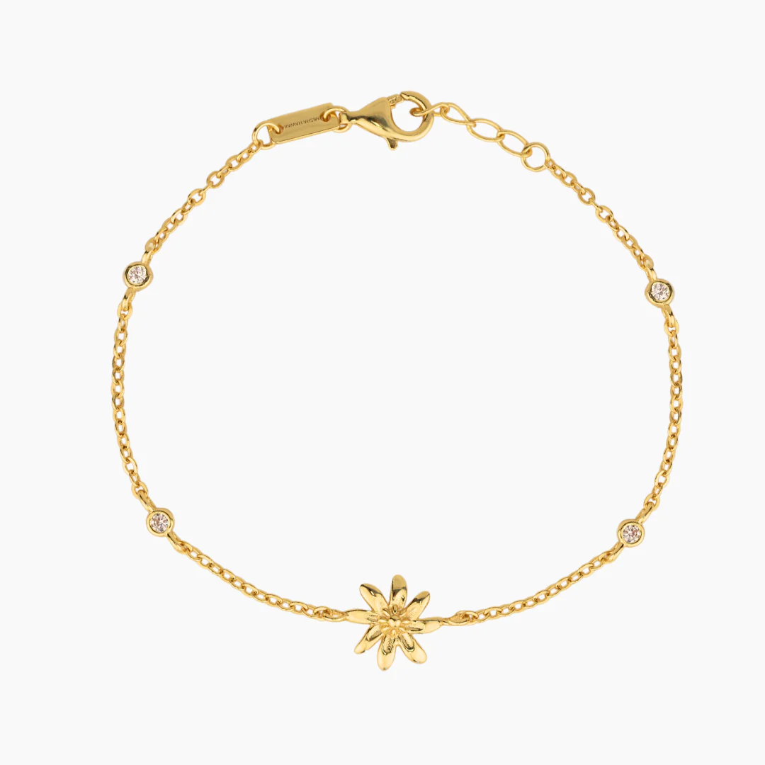 タヒチのティアレ(Tiare)の花をモチーフにした優美なブレスレット。チェーンにはベゼル留めのキュービックジルコニアがあしらわれ、光を受けてきらりと輝きます。 ティアレの花は、その繊細な花びらと透き通るような香りで「愛」「純粋さ」「優雅さ」の象徴とされ、装いに華やかさを添えるアクセントになります。 素材:14kt ヴェルメイユ 長さ:約15.88 cm + エクステンション部分 約1.27 cm