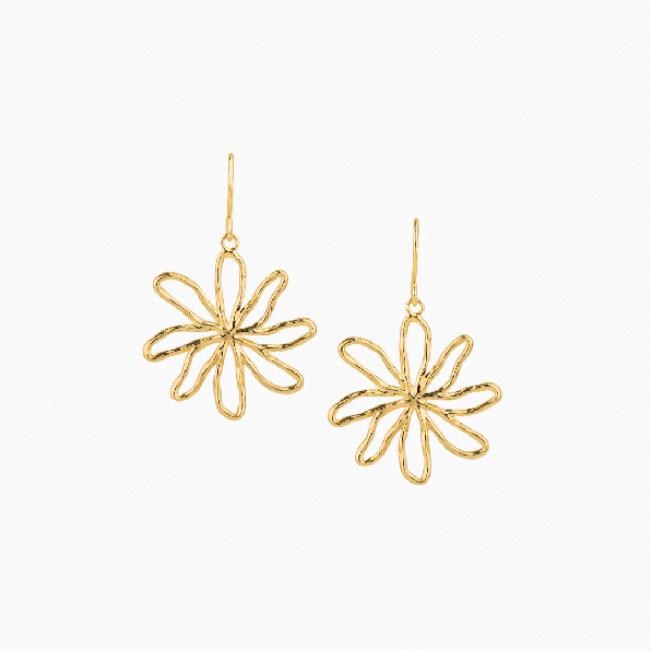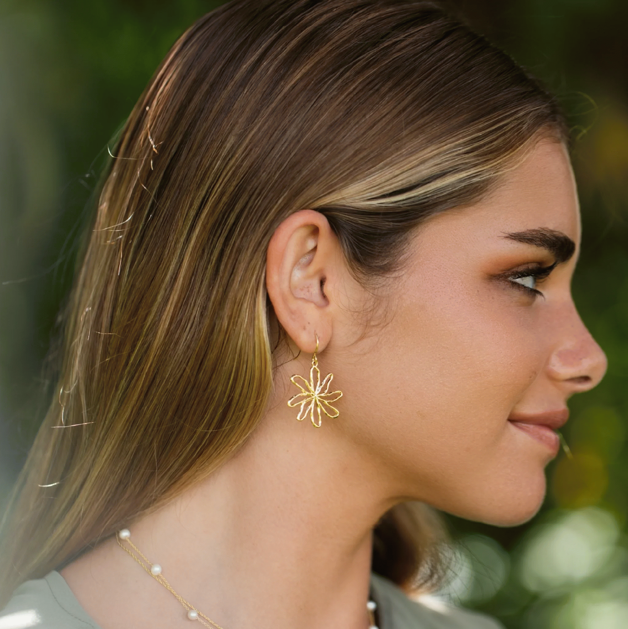 タヒチのティアレ(Tiare)の花をモチーフにした、揺れるタイプのエレガントなピアス。ゴールドトーンの仕上げが華やかな印象を与えつつ、14金ゴールドプレーテッド仕様で軽さを兼ね備えています。 ティアレの花は、その繊細な花びらと透き通るような香りで「愛」「純粋さ」「優雅さ」の象徴とされ、装いに華やかさを添えるアクセントになります。 素材:14kt ヴェルメイユ ティアレモチーフ部分 サイズ: 約25 mm